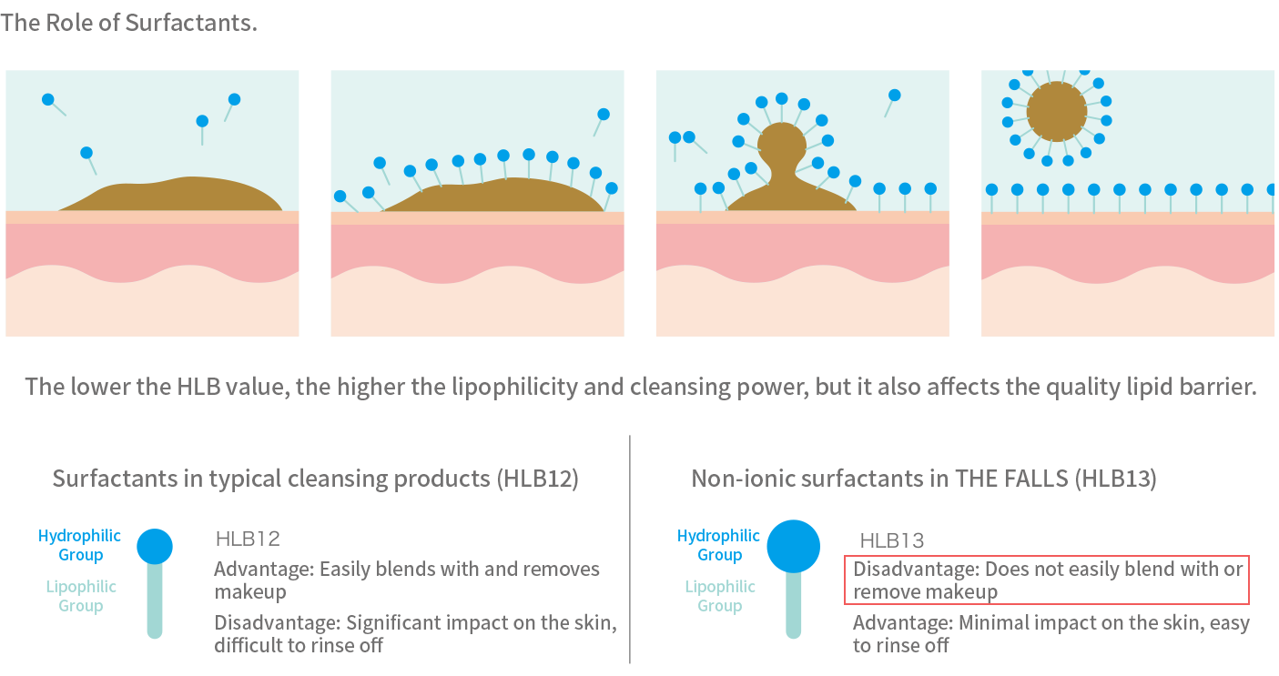 M/EDICAL PROOF THE FALLS focused on the number "HLB12," which has been a common standard in gel cleansers. By controlling this number, we successfully enhanced the cleansing power dramatically without irritating the skin. By increasing the hydrophilic group, we achieved a gentle cleansing power that only removes dirt from the skin surface, while addressing the weakness of cleansing power by pursuing viscosity. This resulted in a formulation that easily blends with makeup and is easy to rinse off.