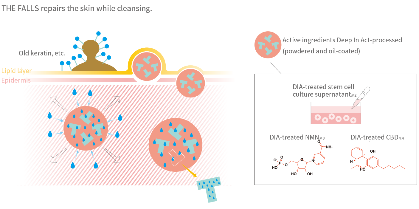 The DIA-processed stem cell culture supernatant※2correctly guides the "tissue engineering" process, which is the skin's regeneration mechanism. The DIA-processed NMN※3replenishes skin components that decrease with aging. Additionally, the DIA-processed CBD※4suppresses skin fluctuations. M/EDICAL PROOF THE FALLS realizes the penetration of active ingredients※1while maintaining the necessary sebum layer.