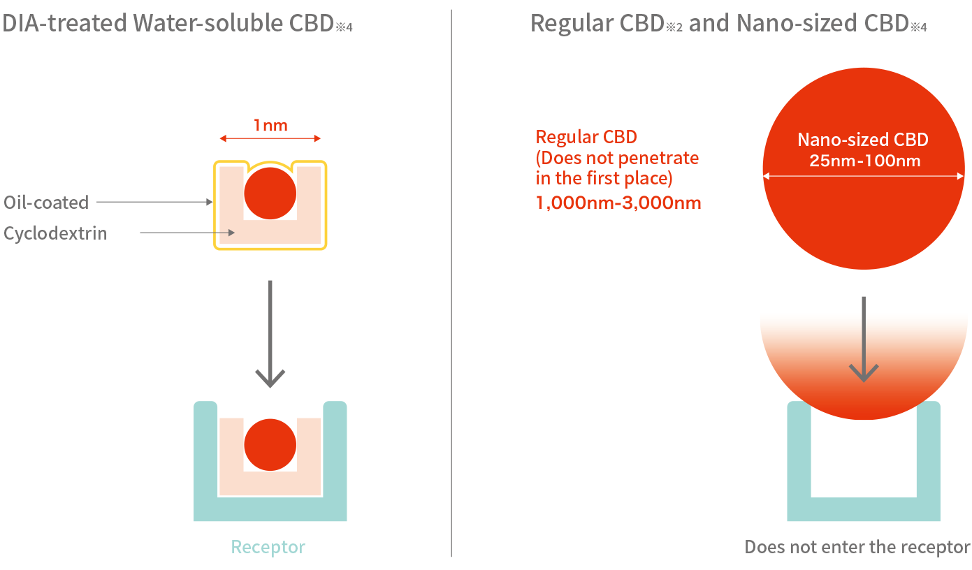 M/EDICAL PROOF has succeeded in approaching cannabinoid receptors, something that conventional CBD※4could not achieve, by processing CBD※4to a size of 1nm, the same as DNA (1/1,000 the original size of CBD). As a result, it has achieved superior effectiveness compared to conventional CBD※4, leading you to your true self.