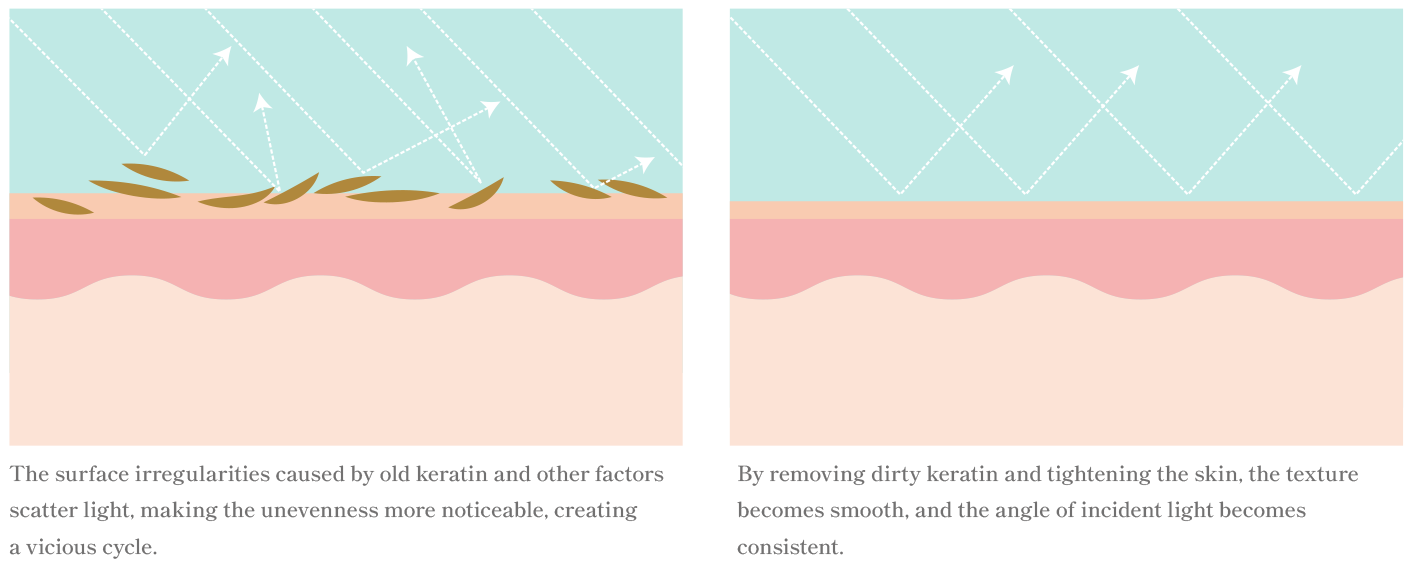 Wash away dullness with an external mechanism. Utilizing the power of enzymes, it removes only the dirty keratin without any friction.