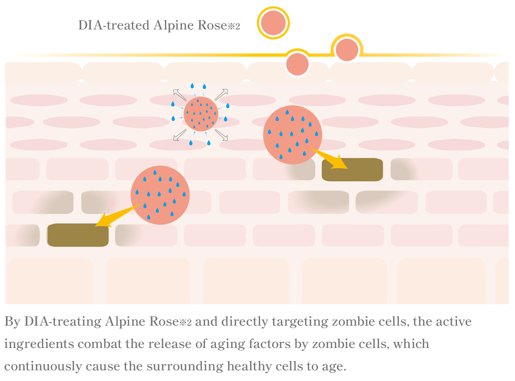 Zombie cells, which release substances that cause inflammation and accelerate the aging of surrounding cells, are like zombies within the skin. The DIA-processed Alpine Rose※2contained in M/EDICAL PROOF THE FLOW has succeeded in eliminating these accumulating zombie cells.